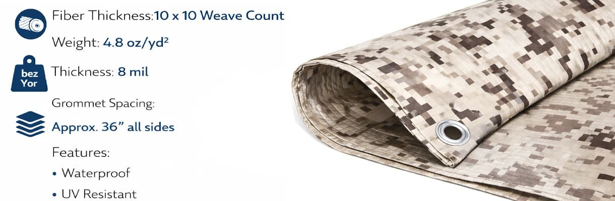 These tarps are constructed with a durable 10×10 weave polyethylene material that is waterproof, rot-proof, and UV resistant. Reinforced with grommets placed every 36 inches, digital camouflage tarps provide dependable protection in both short-term and long-term outdoor applications.