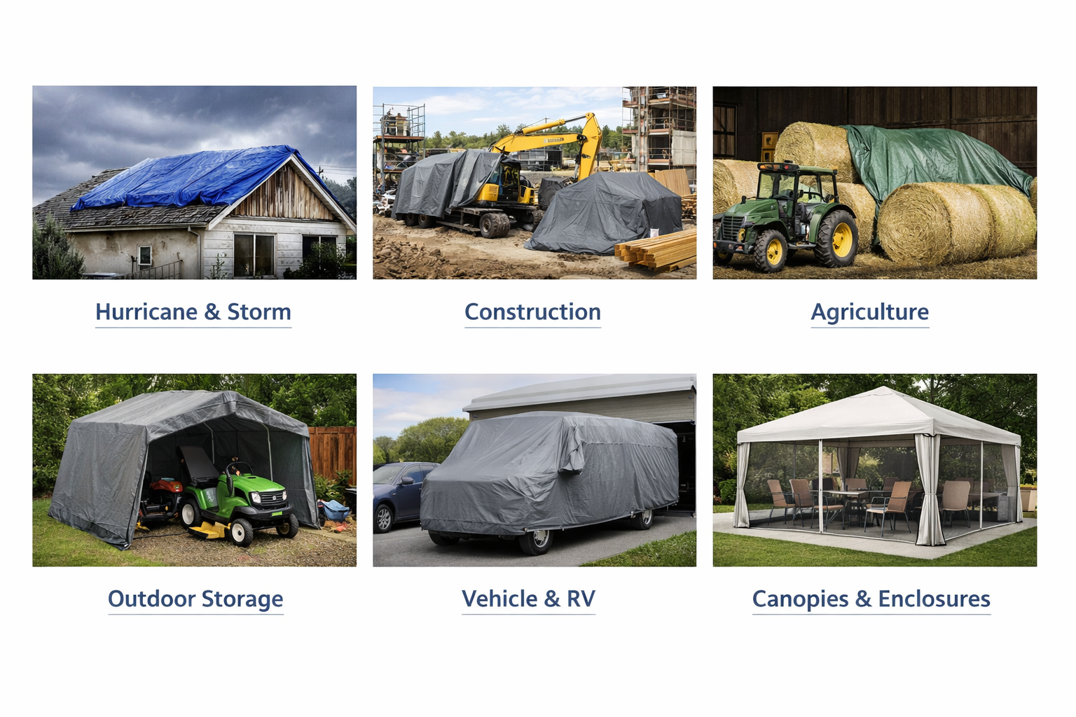 Browse tarps, canopy covers, and accessories organized by how they are used — from storm protection to construction coverage and outdoor equipment storage. Each section links to curated solutions tailored to common needs so you can find the right protective solution quickly.