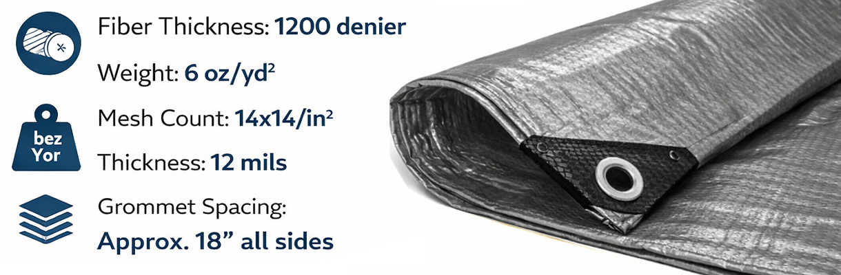 Our heavy-duty silver tarps are built for long-term outdoor protection in demanding environments. Constructed from 12 mil thick, 1200 denier polyethylene, these tarps feature a 14 × 14 mesh count, heat-sealed seams, and reinforced corner guards for added strength and durability.